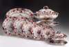painted and printed in the chinoiserie manner with central urn of peonies and chrysanthemums and foliage, in rust, deep blue, green and gilt on a printed puce ground, puce printed mark 'Real Ironstone China' and painted pattern number '149', comprising twin handled soup tureen,13cm wide, cover and stand, sauce tureen, cover and stand, 19cm long, meat serving dish, 52cm long, with draining stand, six graduated serving ashets, 27-47cm, a rectangular double handled scalloped serving dish and cover, 30cm long , an oval double handled sauceboat with attached stand,17cm long, a shaped sweetmeat dish,14cm long, two oval vegetable dishes, 27 & 29cm long, ten soup plates, 26cm diameter, thirteen dinner plates, 26cm diameter, twelve dessert plates, 23cm diameter, six side plates, 20cm diameter, six tea plates, 17cm diameter