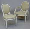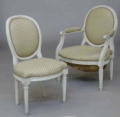 by Colefax and Fowler including one fauteuil and three side chairs, each with moulded oval back above bowfront stuffover seat on turned and stop fluted tapering legs (4)