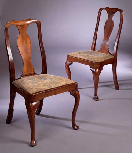 A matched pair of George I walnut side chairs