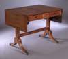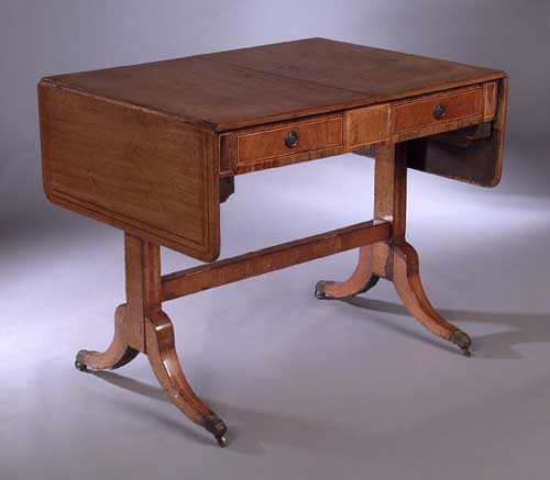 with boxwood and ebony stringing and rosewood crossbanding, the rectangular hinged top with rounded angles above two frieze drawers opposing two dummy drawers raised over rectangular section supports, linked by a stretcher on inlaid sabre legs terminating in brass cups and castors