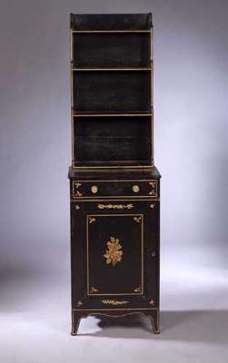 the waterfall open shelved top raised on base with single drawer above panelled door enclosing shelved interior, on shaped apron and splayed bracket feet