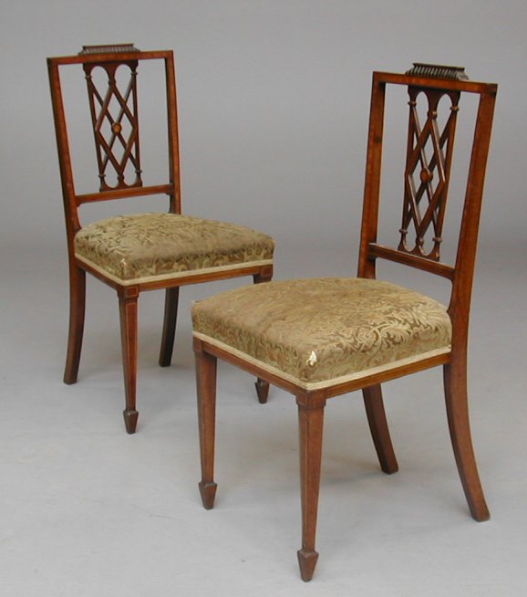 each with rectangular satinwood crossbanded back, and boxwood strung lattice splat, the stuffover seat raised on square section tapering legs with spade feet