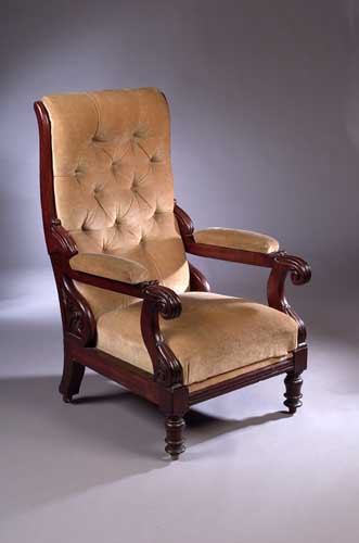 the buttoned upholstered back between moulded scrolling uprights above open arms with padded rests and scrolling terminals raised on baluster turned front legs, the back and seat reclining together