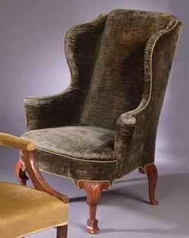 the green velvet upholstered back and splayed out scrolled wings and arms above bow front seat raised on carved and turned walnut front legs with pointed toes, cabriole rear legs