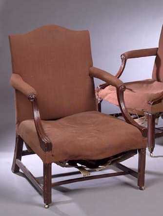 the serpentine top rail above padded open arms with downswept moulded supports, serpentine seat rail and moulded chamfered legs with castors joined by H-stretcher