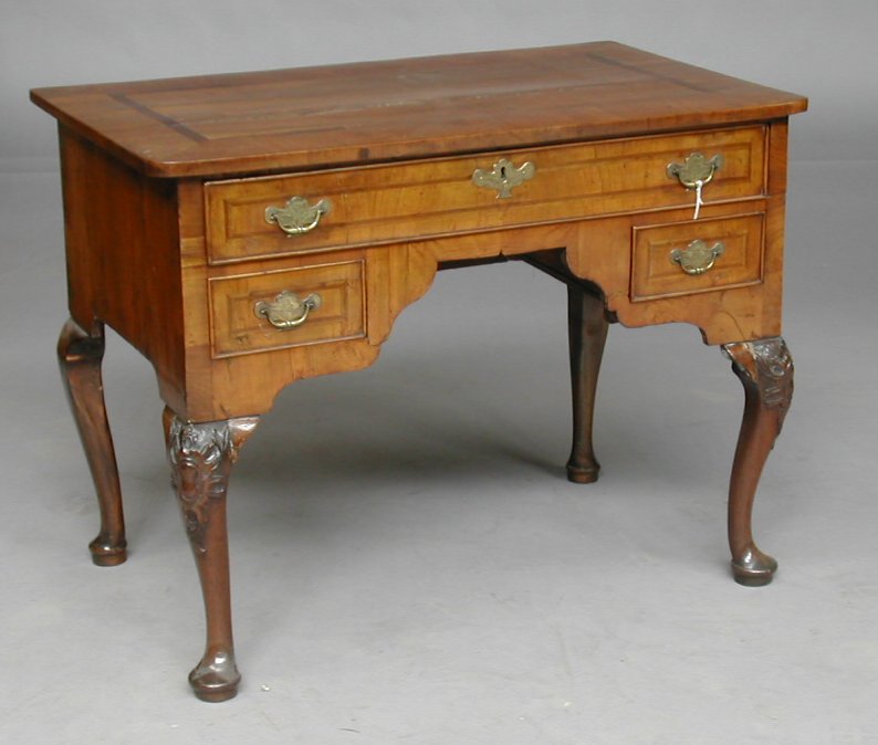 the rectangular crossbanded top with rounded angles above single featherbanded drawer and two short drawers flanking a kneehole raised on cabochon-carved cabriole legs with pad feet (adapted)