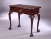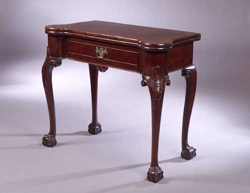the rectangular top with projecting rounded corners above frieze drawers and cabriole legs with carved knees and ball and claw feet