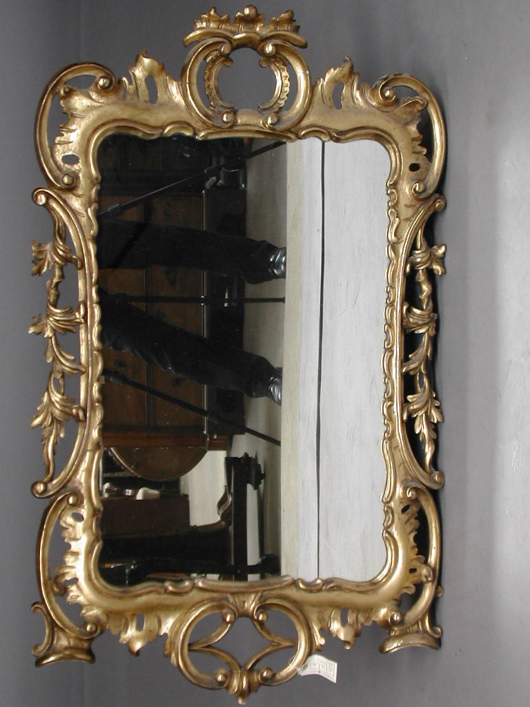 of late 18th century design, the shaped rectangular plate enclosed within profusely carved and pierced frame with C scrolls, leaves and cartouche surmount