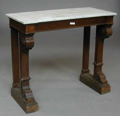 stamped Gillow & Co., the reverse breakfront rectangular Carara marble top with chamfered edge above frieze drawer and scrolled panelled consoles with plain pilaster rear supports, on plinth bases