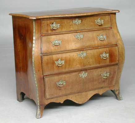 of bombe form, the serpentine rectangular top with moulded edge above four long graduated drawers and shaped apron on splayed bracket feet