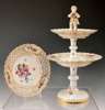 surmounted by a figure of a boy carrying a garland of flowers by a tree stump, above two graduated pierced scalloped plates each with three floral painted cartouche panels, on spirally fluted knopped circular plinth, with blue crossed sword mark, 41cm high; also a shallow tazza to match, with impressed script number 'E162'; and a set of six matched plates, 23cm diameter (8)