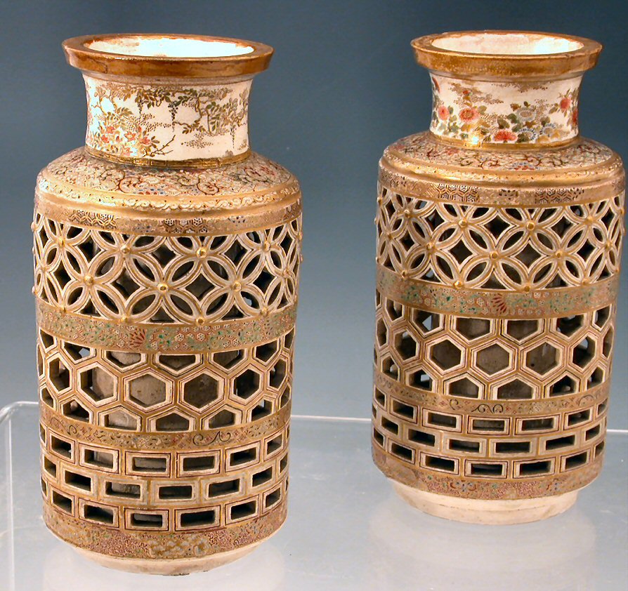 with narrow flared neck above shoulder with brocade frieze and cylindrical body, the central surrounded by three rows of pierced friezes separated by bands of brocade