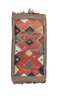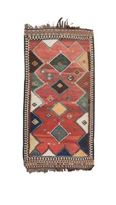 the abrash red field with four polychrome lozenge medallions, similar half medallions to the sides, within brown border, striped elem