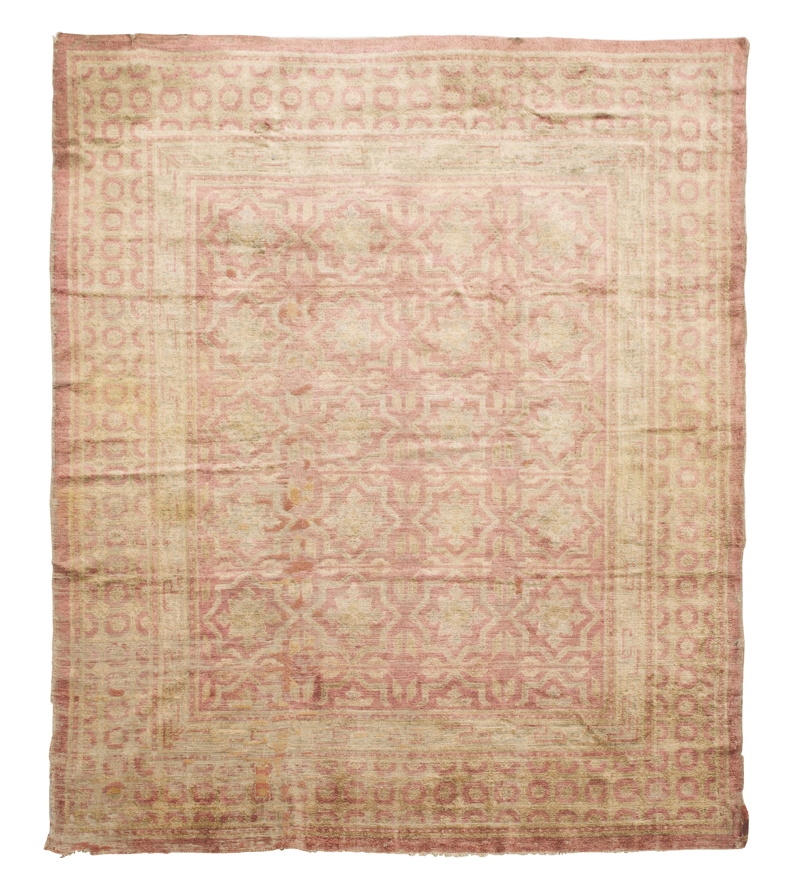 the pink field with allover gold star lattice pattern, within gold pink circle border