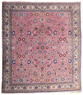 the pink field with allover palmette and vine pattern, within cream rosette, palmette and vine border between bands