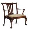 with a serpentine and scroll top rail with pierced vasiform splat between splayed arm supports, above an upholstered drop-in seat raised on shell carved cabriole legs, terminating in hairy paw feet