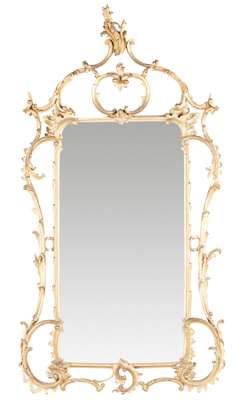the shaped rectangular bevelled mirror plate within an openwork frame of C and foliate scrolls
