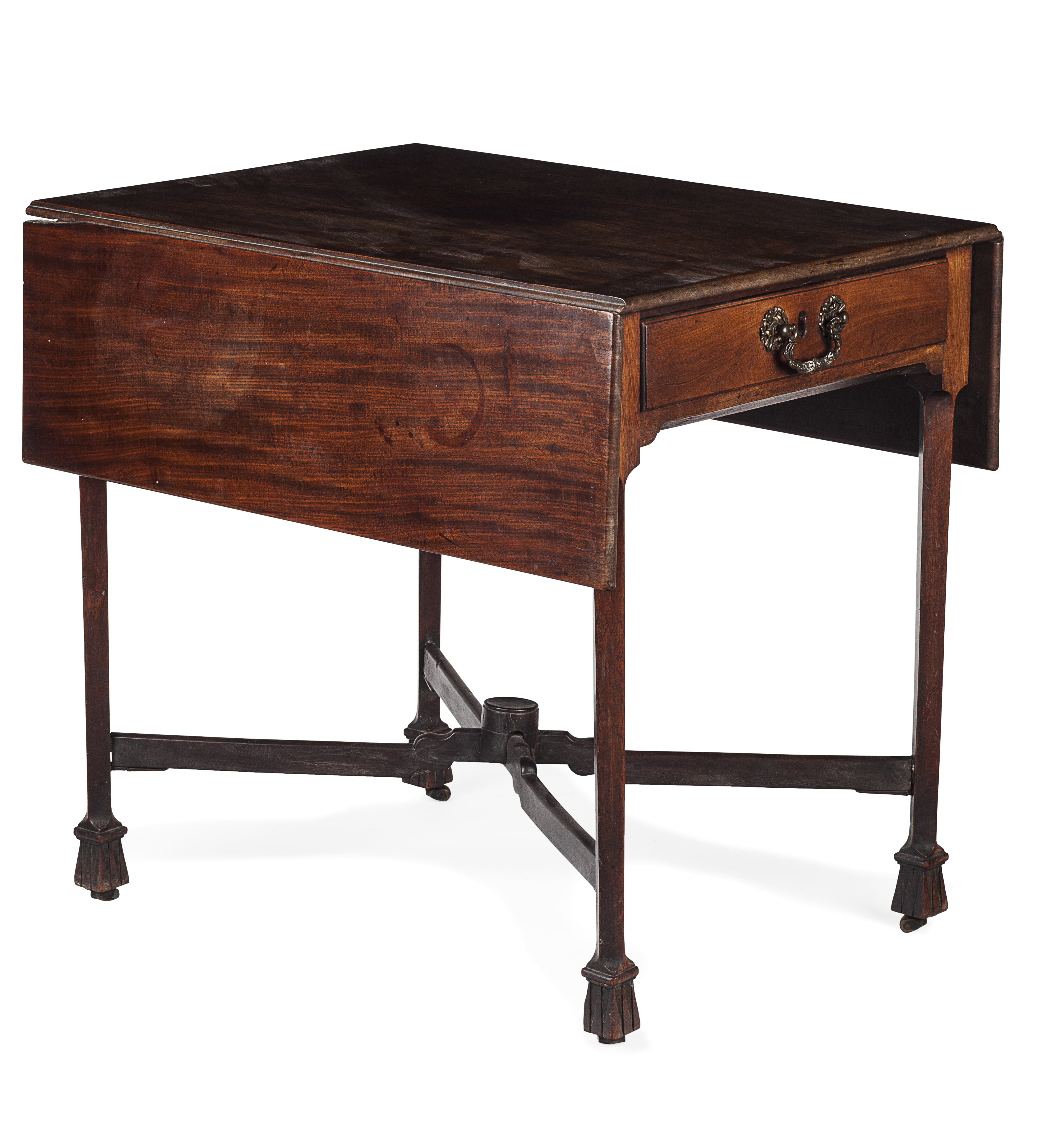 the rectangular top with drop sides over a drawer to one end, raised on square legs joined by a cross stretcher and ending in tassle feet with leather castors