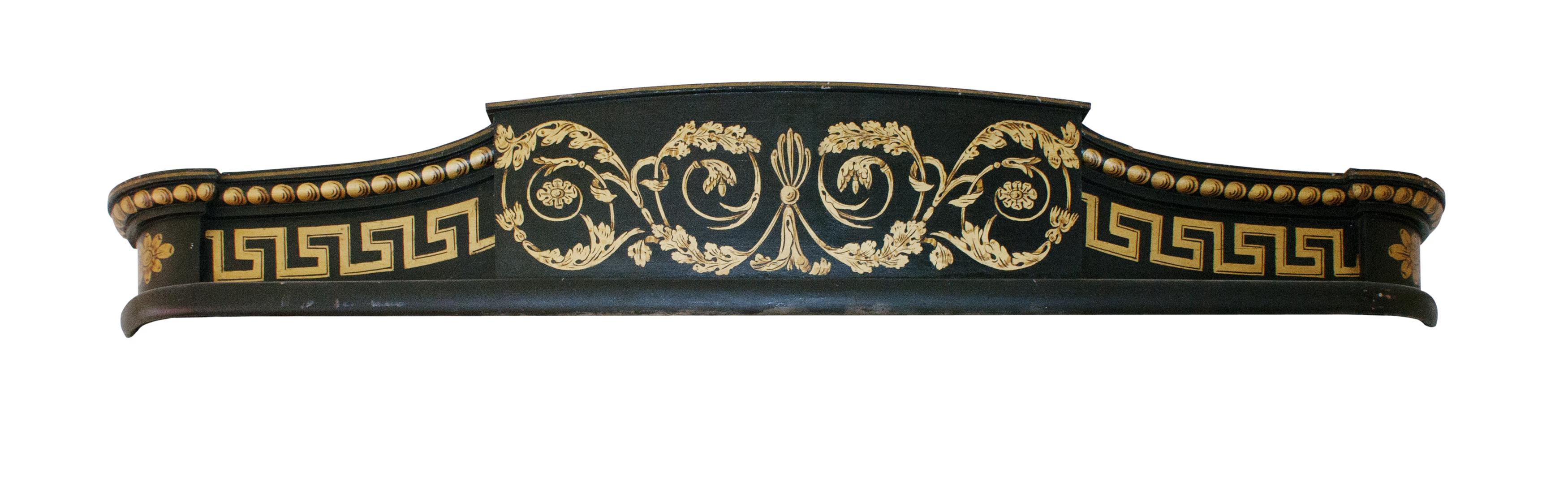 the shaped and moulded frieze panels painted in dark blue with gilt foliate scrolls, Greek key, and beaded decoration (2)