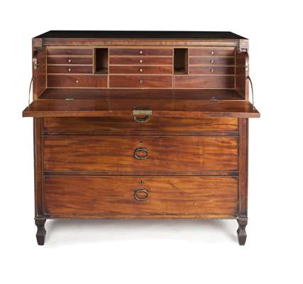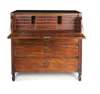 the rectangular top over a fall front drawer fitted with drawers and compartments, over a long drawer fitted with compartments and two further long drawers, raised on waisted block feet