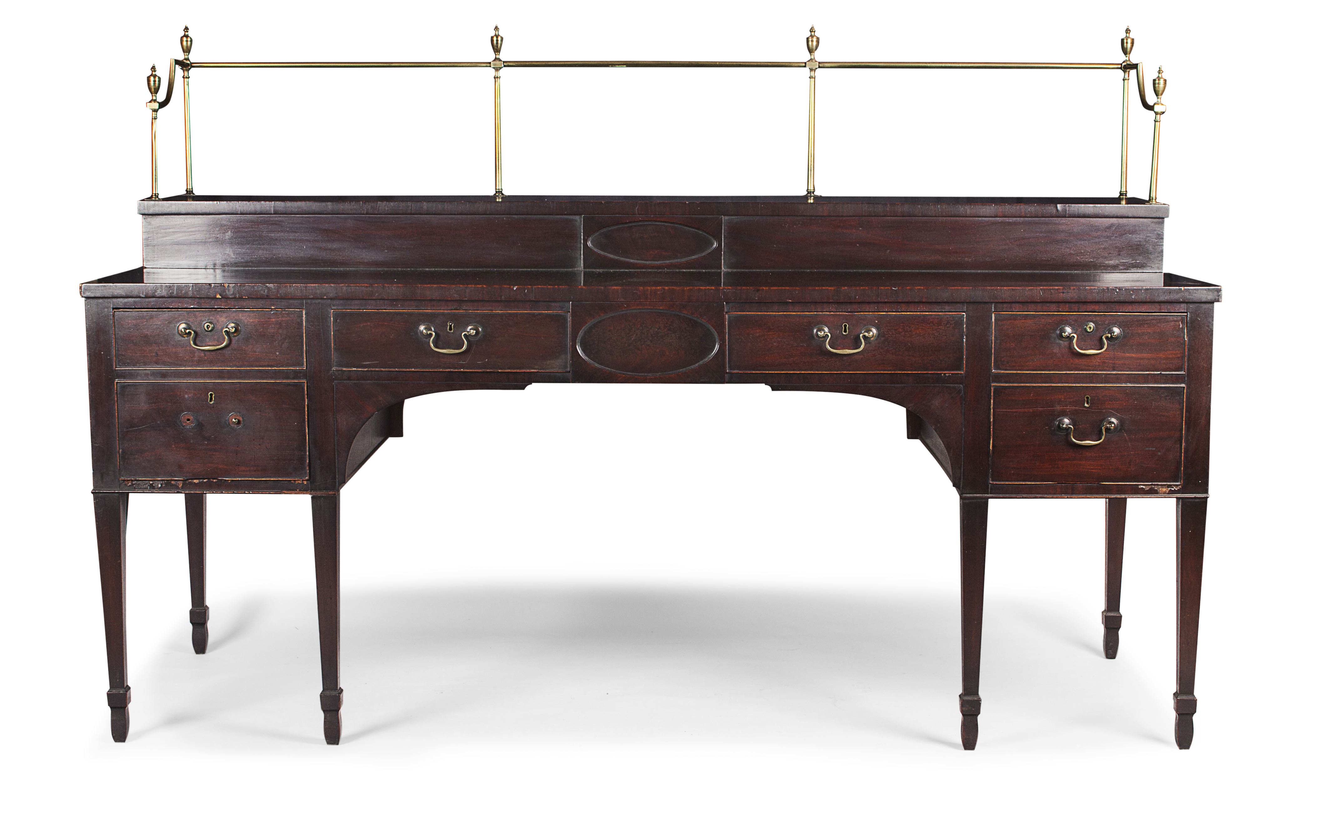 the brass gallery with urn finials above a ledge back, the frieze with two short drawers and centred by an oval moulded panel, flanked by deep drawers disguised as two short drawers, raised on square tapered legs ending on block waisted feet