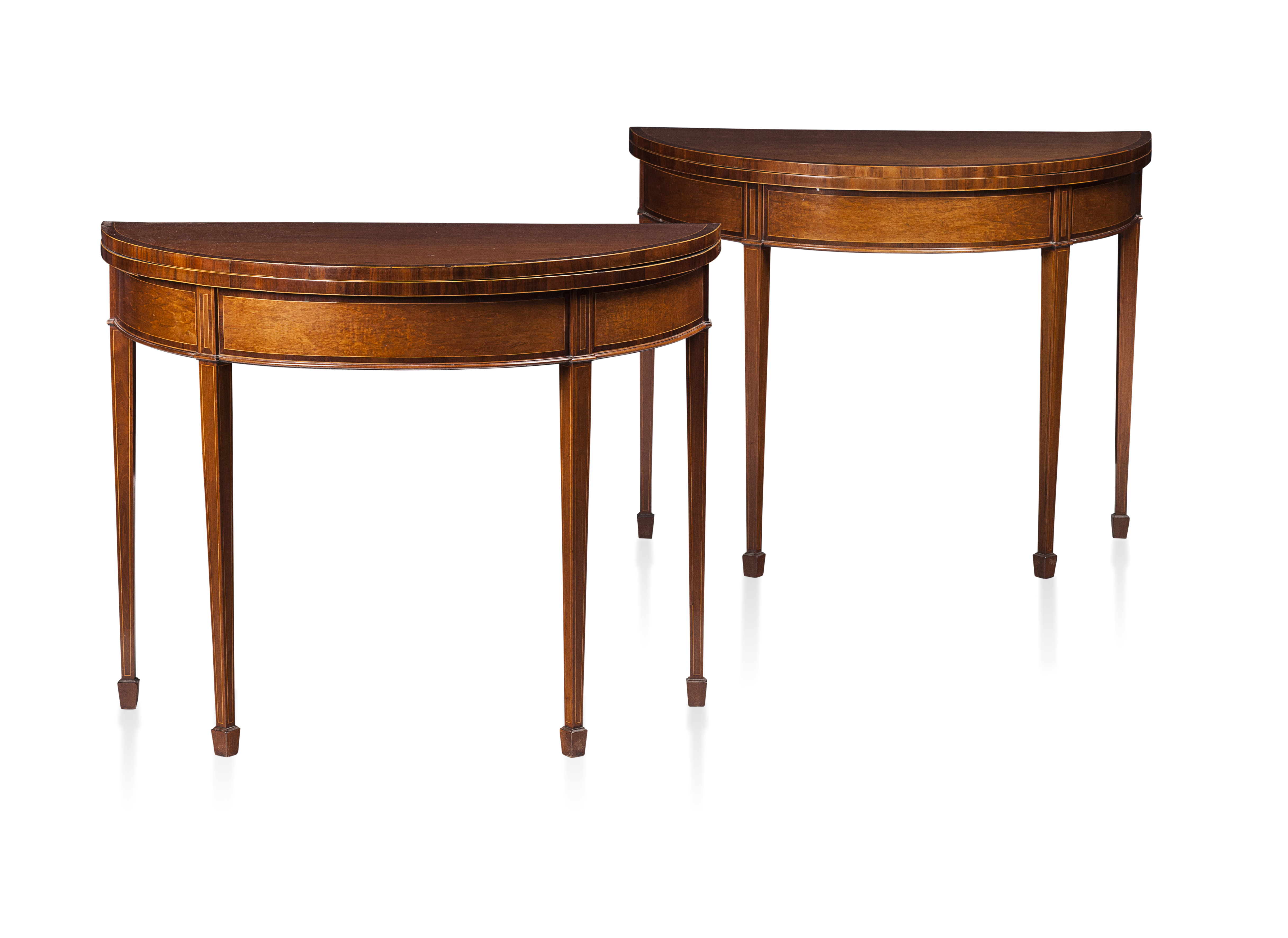 PAIR OF GEORGE III SATINWOOD AND MAHOGANY FOLDOVER DEMILUNE GAMES TABLES