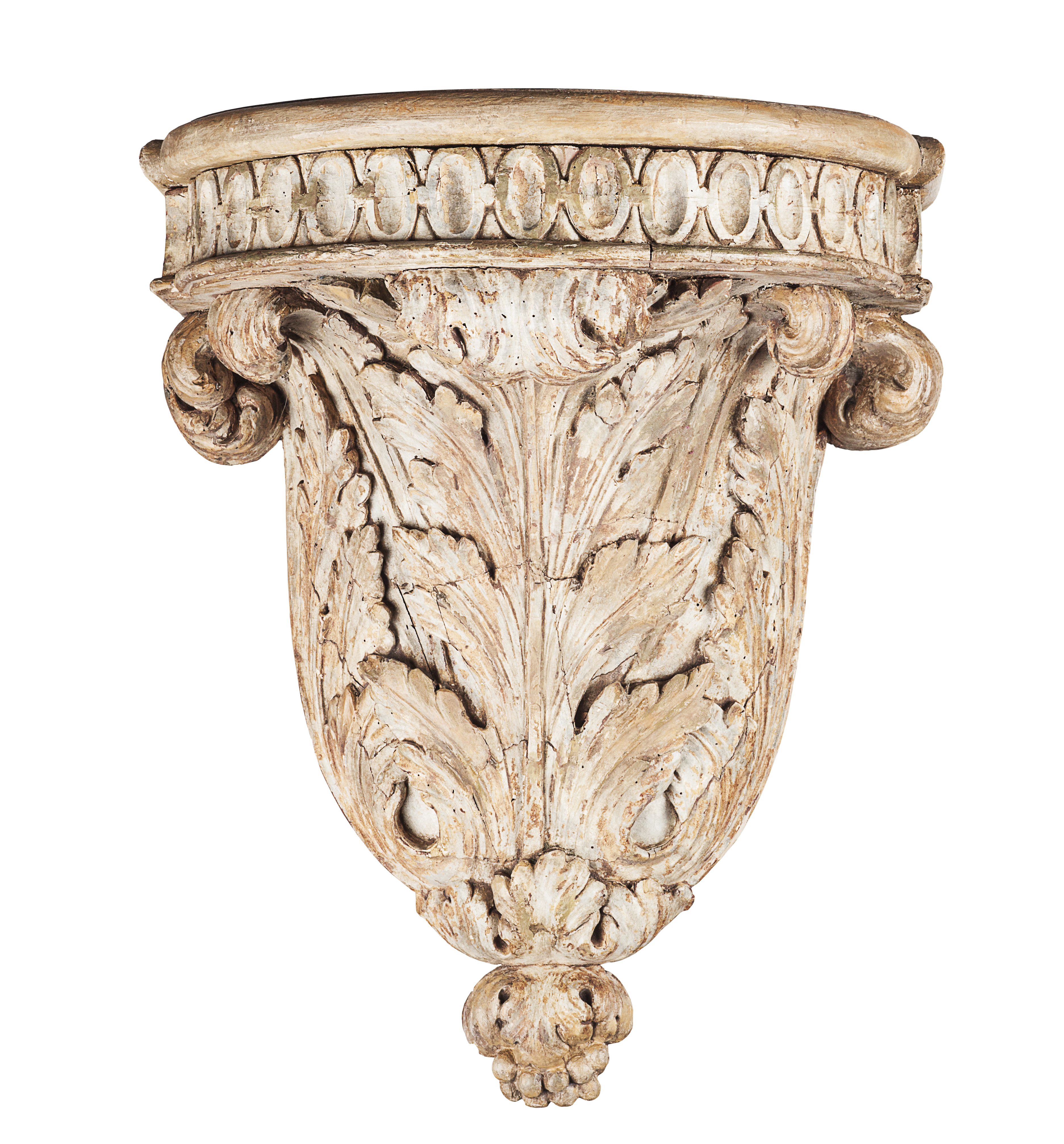 the shaped demilune top over a carved frieze on an acanthus bracket with a berry drop finial