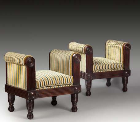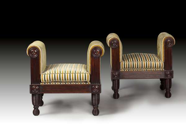 FINE PAIR OF REGENCY MAHOGANY UPHOLSTERED STOOLS