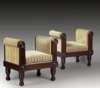 the high enclosed arms with reeded uprights headed by roundels, the loose cushion seats in yellow and green stripe upholstery, above reeded seat rails raised on ring turned legs and ball feet (2)