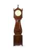 the ogee arched hood with three finials above a circular gilt brass dial with maker's name and separate dials for the hours, minutes and seconds, above a lyre form trunk with bow front door with anthemion details, on a base with a shaped apron and bracket feet