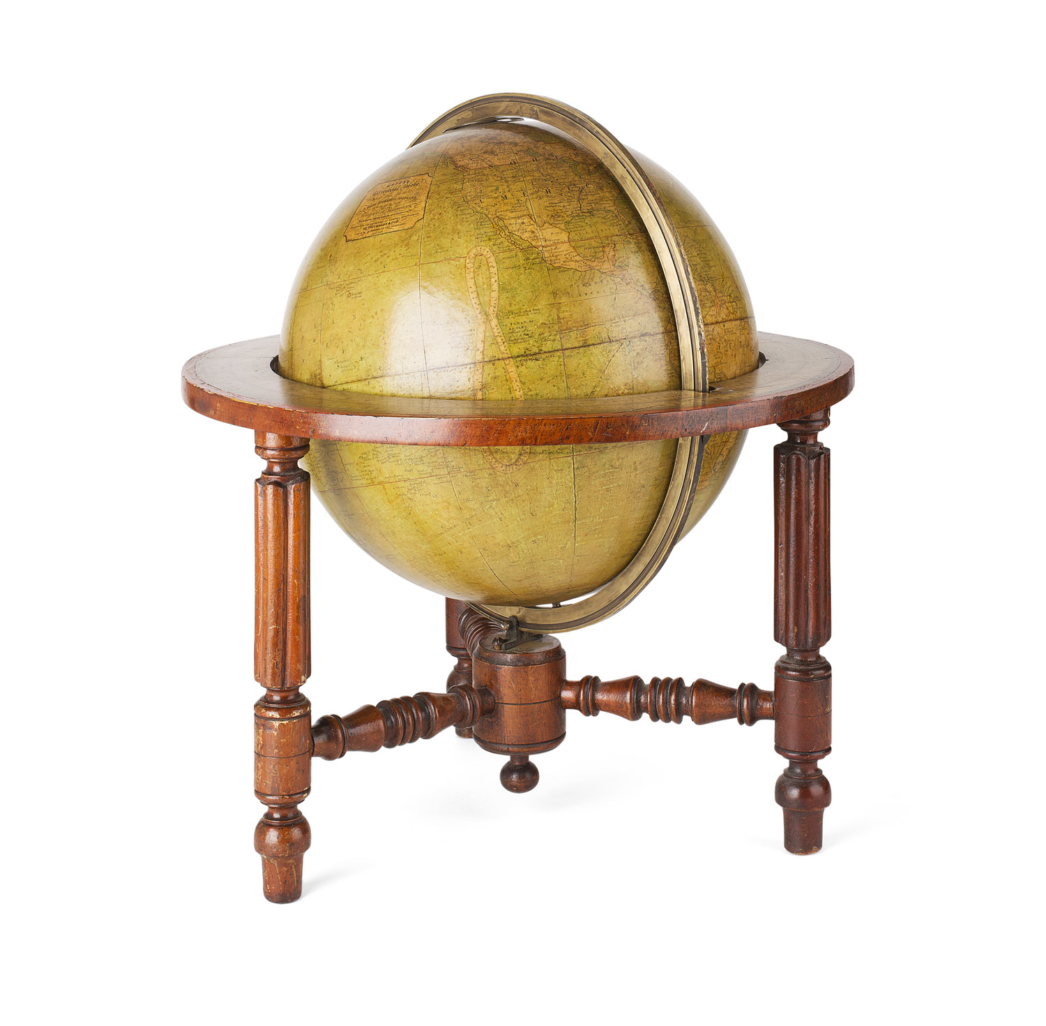with maker's label 'MALBY'S TERRESTRIAL GLOBE Compiled from the latest & MOST AUTHENTIC SOURCES Including all the recent Geographical Discoveries Manufactured and Published under the superintendance of the SOCIETY FOR THE DIFFUSION OF USEFUL KNOWLEDGE BY THOS. MALBY & SON MAP & GLOBE SELLERS TO THE ADMIRALTY Jany. 1849', on a turned and carved mahogany stand