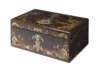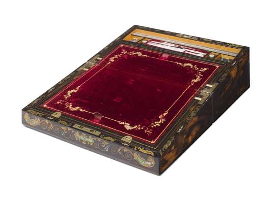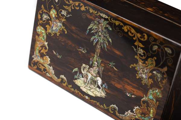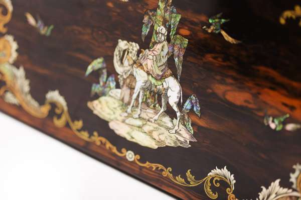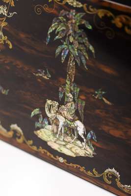 the hinged lid centred by a mother of pearl and abalone inlaid scene depicting an Arab man riding a camel and another attending, enclosed by birds and shells, the fitted interior with an inkwell and tools with mother of pearl handles, the lock marked 'Hobbs Patent Protector, Cheapside, London'