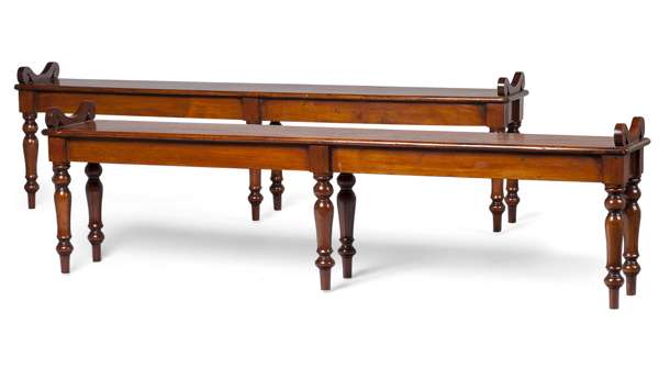 each with a long rectangular seat with scrolled ends raised on six baluster turned legs with toupie feet (2)