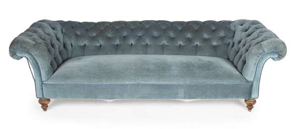 of typical form with a button tufted back and arms upholstered in blue plush fabric, raised on bun feet
