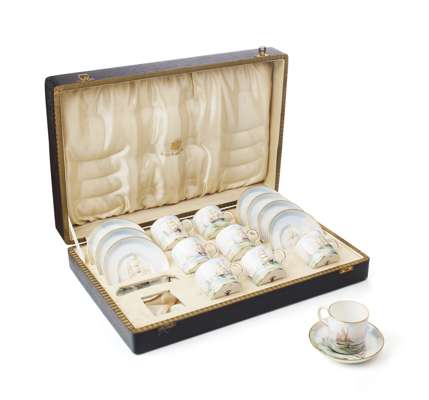 each piece decorated with sailing ships and yachts, with gilt highlights, signed and with maker's marks, in the original case, comprising of: eight coffee cans, 6cm high; and eight saucers, 11.5cm diam (16)