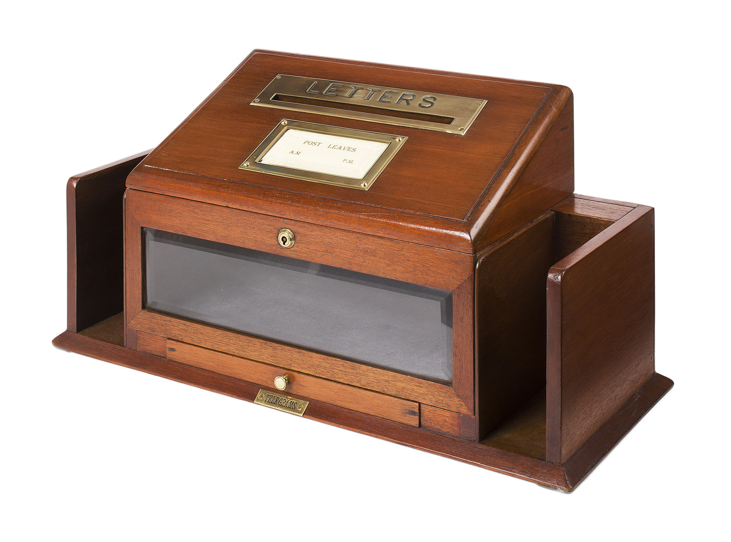of canted form, the central hinged lid with brass plaque INSCRIBED LETTERS, and aperture and glazed collection times section, above a bevelled glazed panel and a narrow pull out tray and brass plaque inscribed TELEGRAMS, with space for letters on both sides