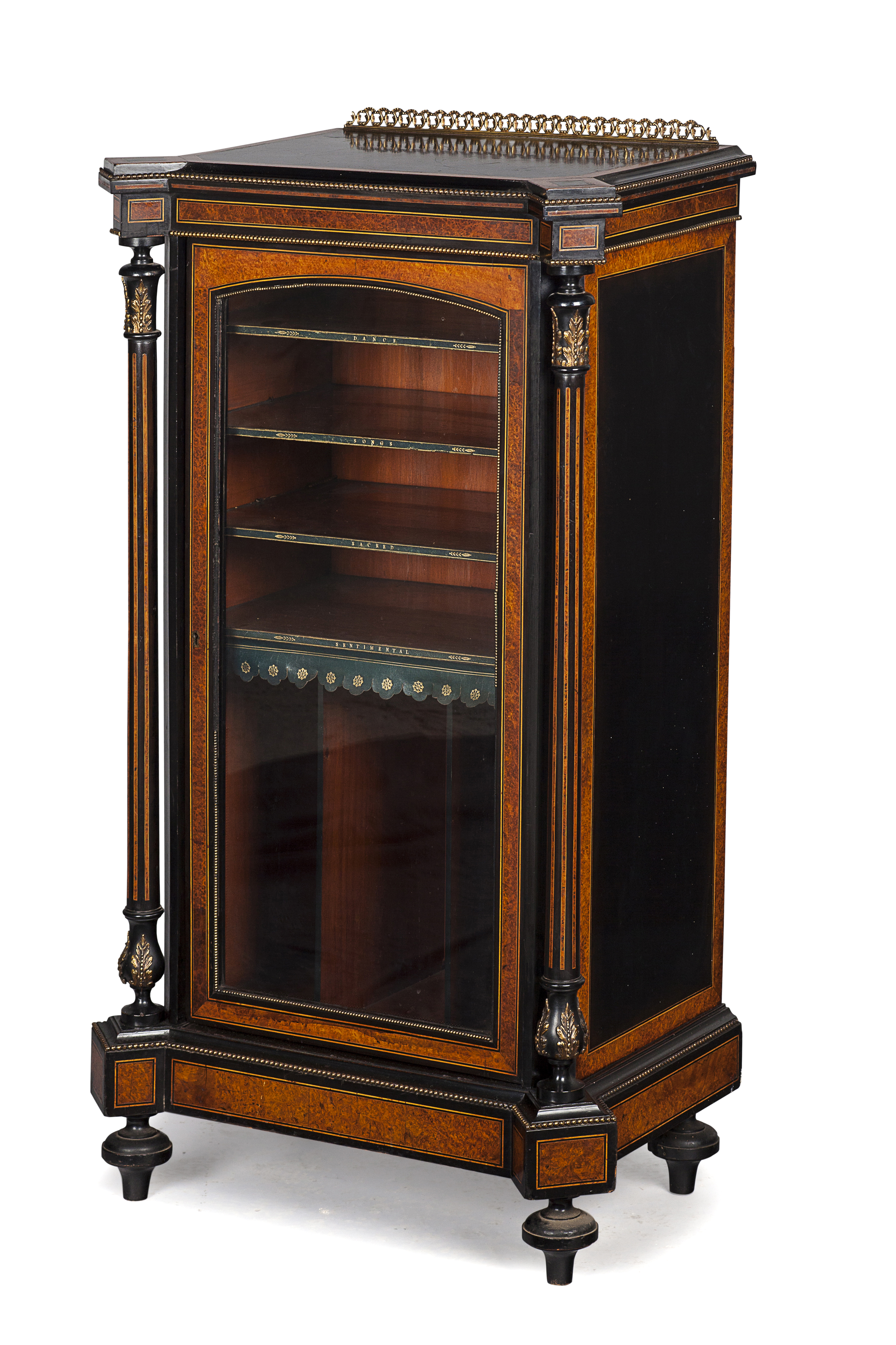 MID VICTORIAN EBONISED AND BURR WOOD INLAID MUSIC CABINET