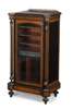 the rectangular top with a giltmetal cast gallery and applied beaded edge, above a single glazed door enclosing drawers and pigeonholes for music, flanked by inlaid columns and raised on a plinth base with toupie feet