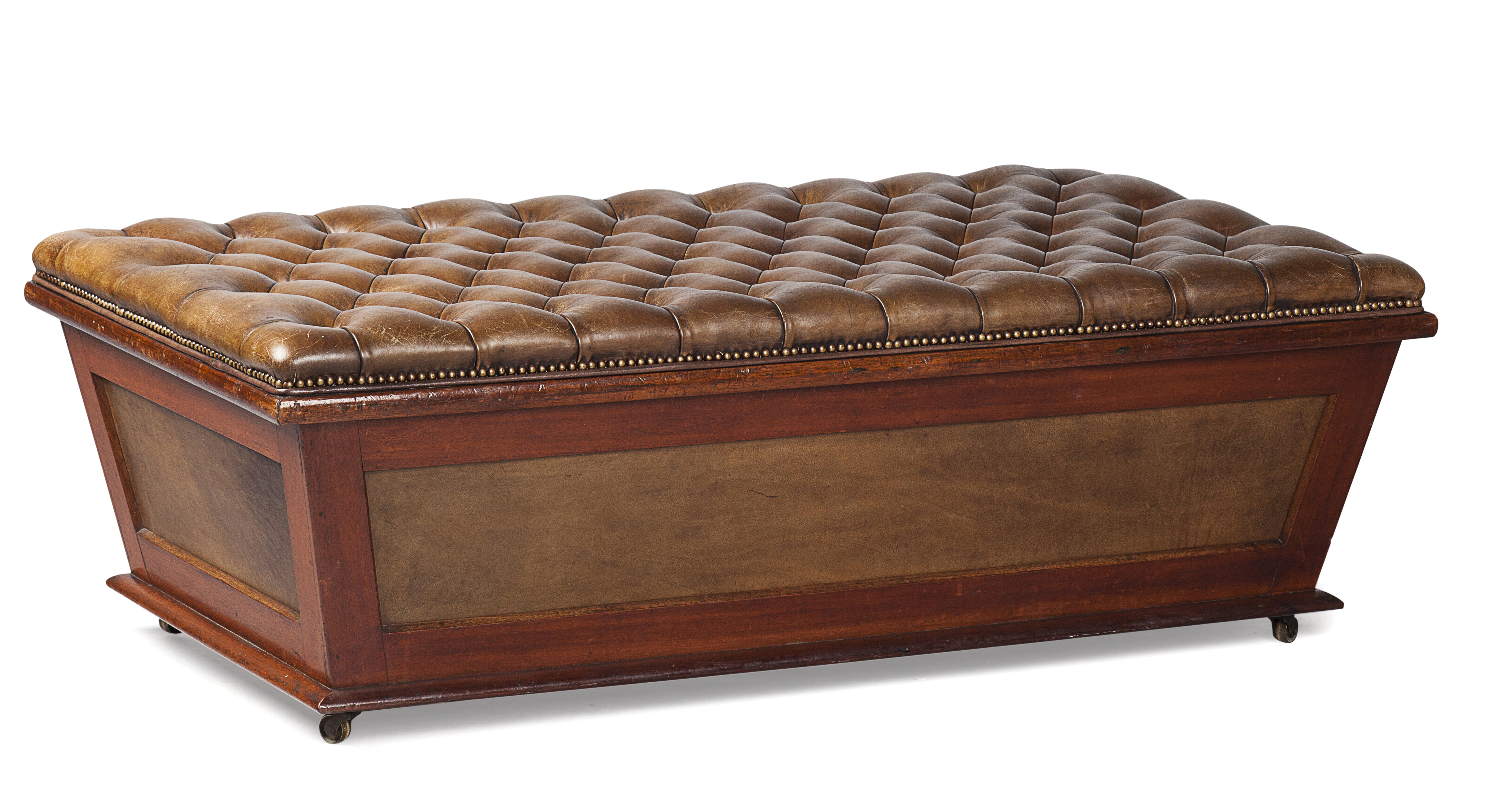 the rectangular button upholstered hinged seat opening to a lined void inerior, the tapered leather-panelled sides on moulded base with castors