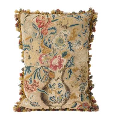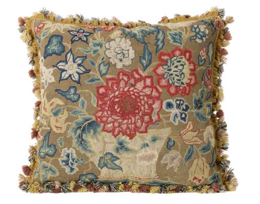 the square example with a central flower within scrolling flowers and leaves; the rectangular example with a flower filled urn; both with tassel trimmings (2)