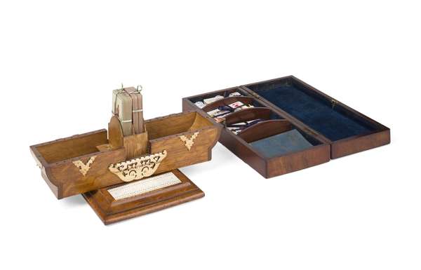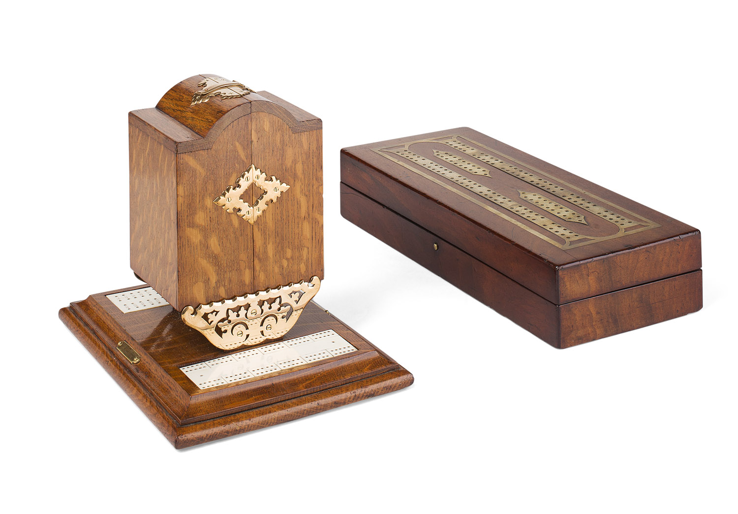the domed hinged lid opening to a compartmented interior with cards, raised on a canted stepped base with two removable ivory and ebony cribbage boards, with two inscribed brass plaques, 25cm wide; together with a VICTORIAN MAHOGANY AND BRASS MOUNTED CRIBBAGE BOX, of rectangular form, with a hinged lid opening to a velvet lined fitted interior with various bone games pieces and cards 35.5cm wide (2)