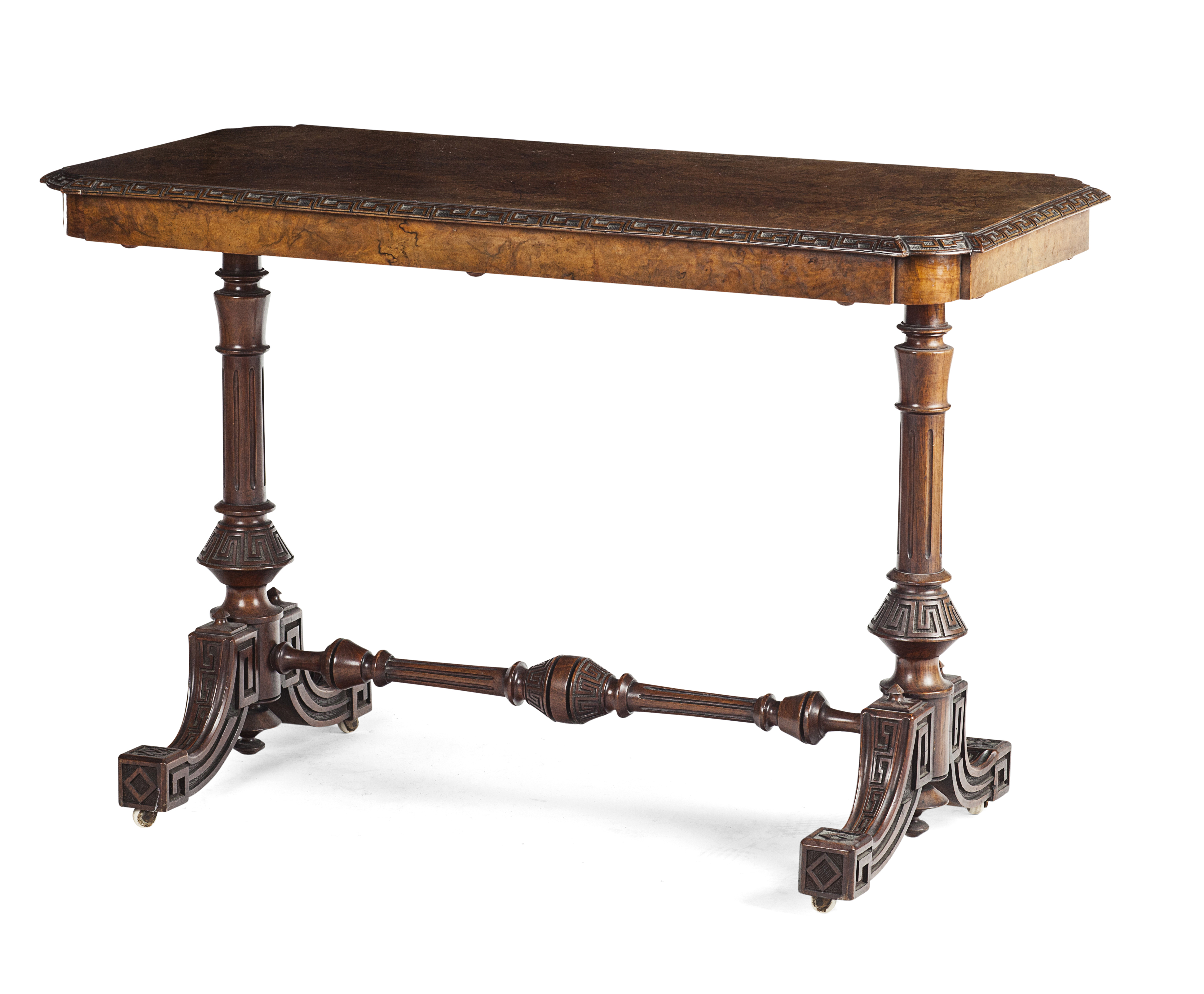 the shaped rectangular top with a key moulded edge raised on fluted end supports and downswept legs on porcelain castors and joined by a turned and key carved stretcher