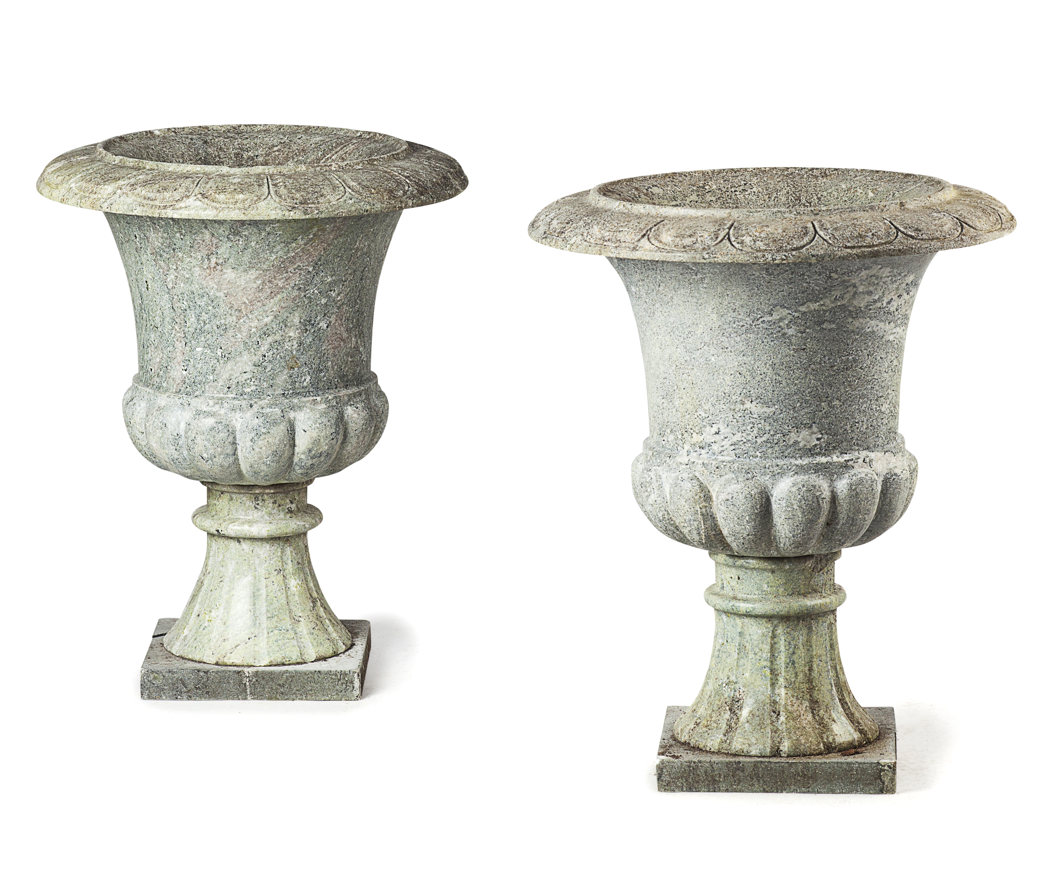 each of campana form with a lobed rim and base, raised on a turned socle and square plinth (2)