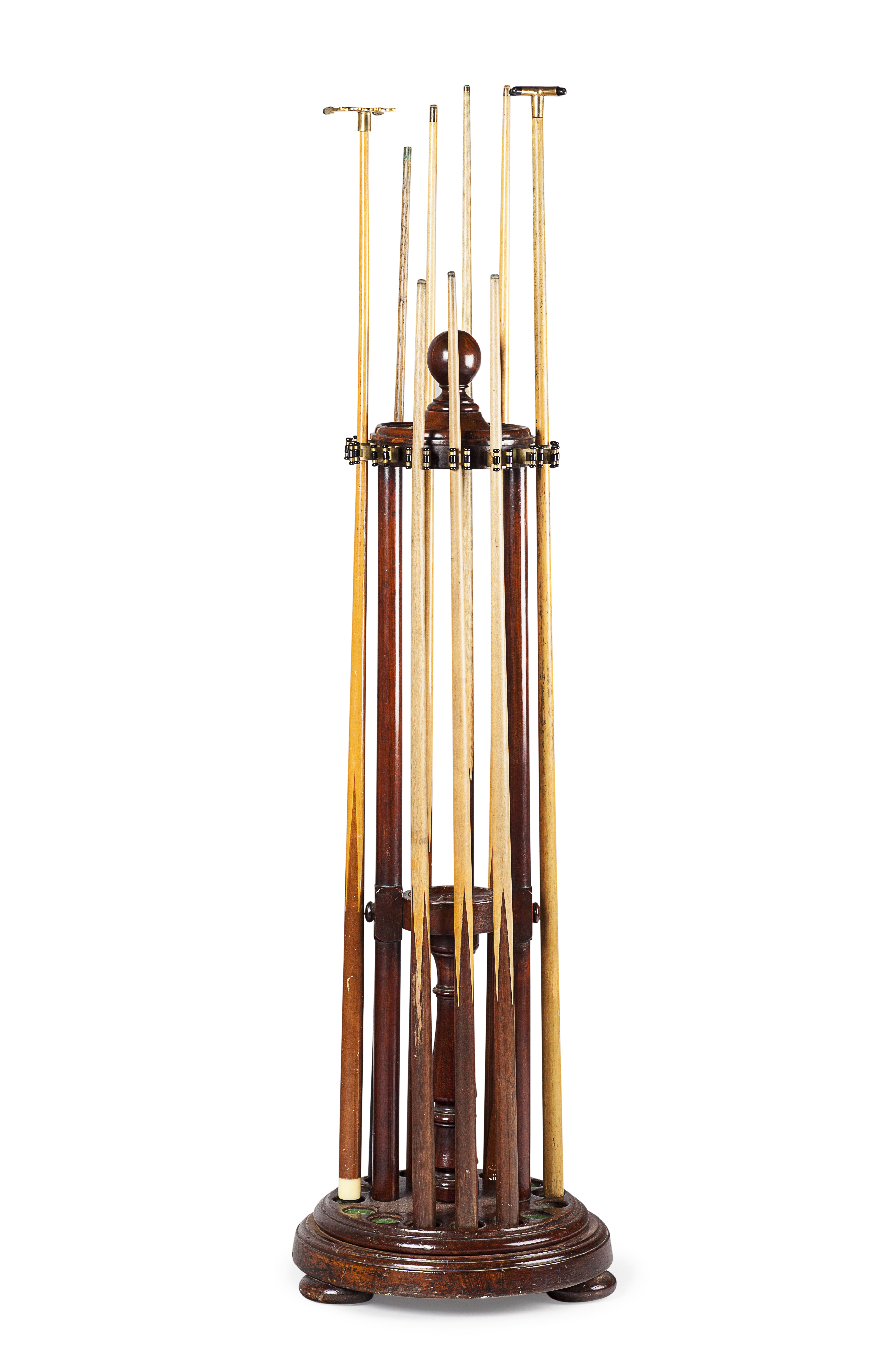 with twin turned and blocked supports supporting a turned surmount with clips for cues, raised above a revolving base with flattened bun feet, includes seven cues and two cue extenders (10)