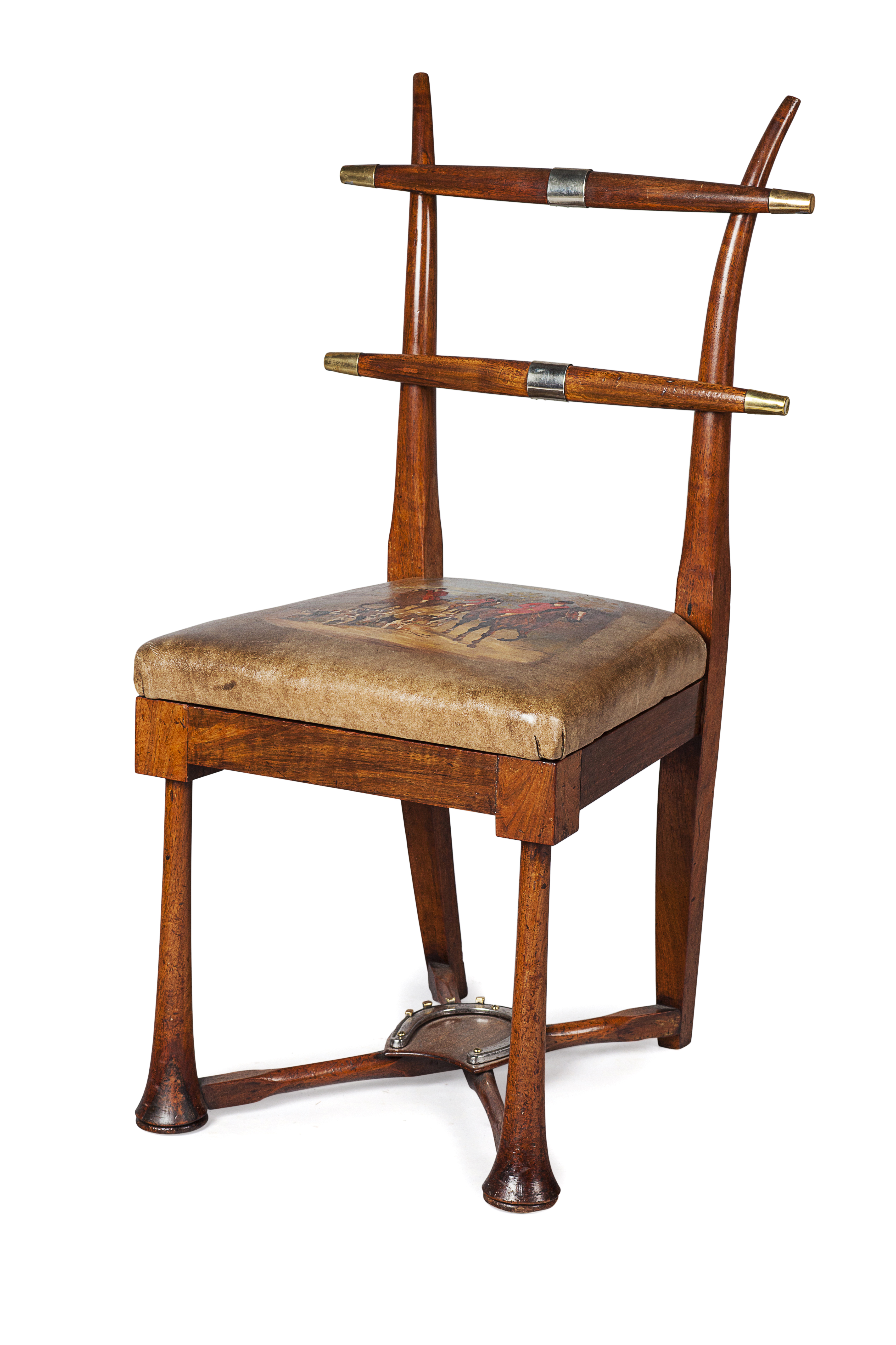 the bar back formed as a harness with brass and silvered mounts, the drop in seat painted with a hunting scene, raised on turned front legs formed as hunting horns and linked by stretchers mounted with a horseshoe