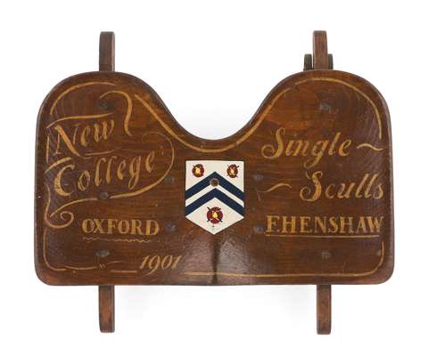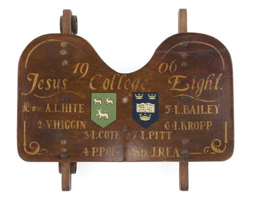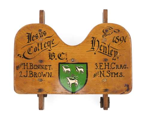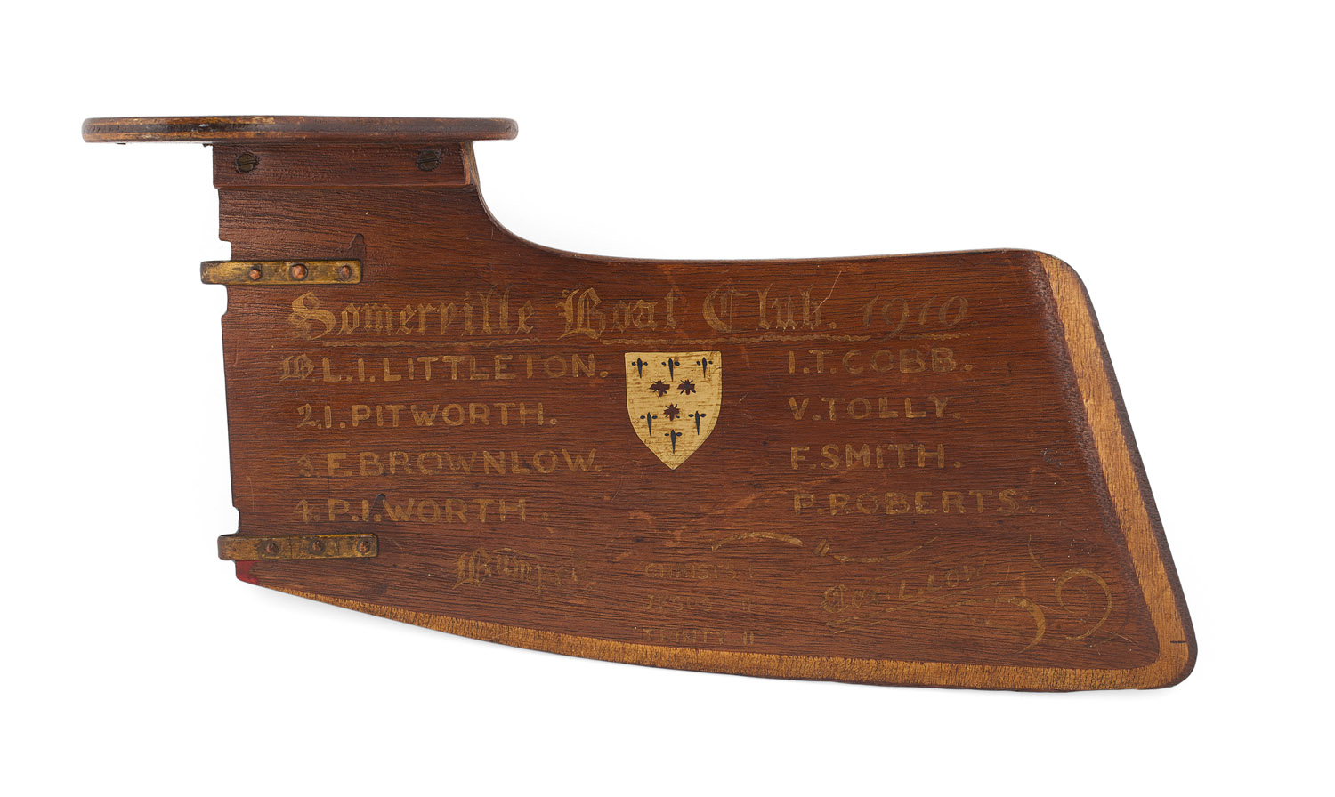 two for Jesus College, dated 1891 and 1906, and one for New College, dated 1901, inscribed with names of rowers and coats of arms, one mentioning the Henley Royal Regatta, 29cm high, 32cm wide; together with a WOODEN RUDDER, inscribed 'Somerville Boat Club, 1910', with coat of arms and the names of rowers, 38cm long (4)