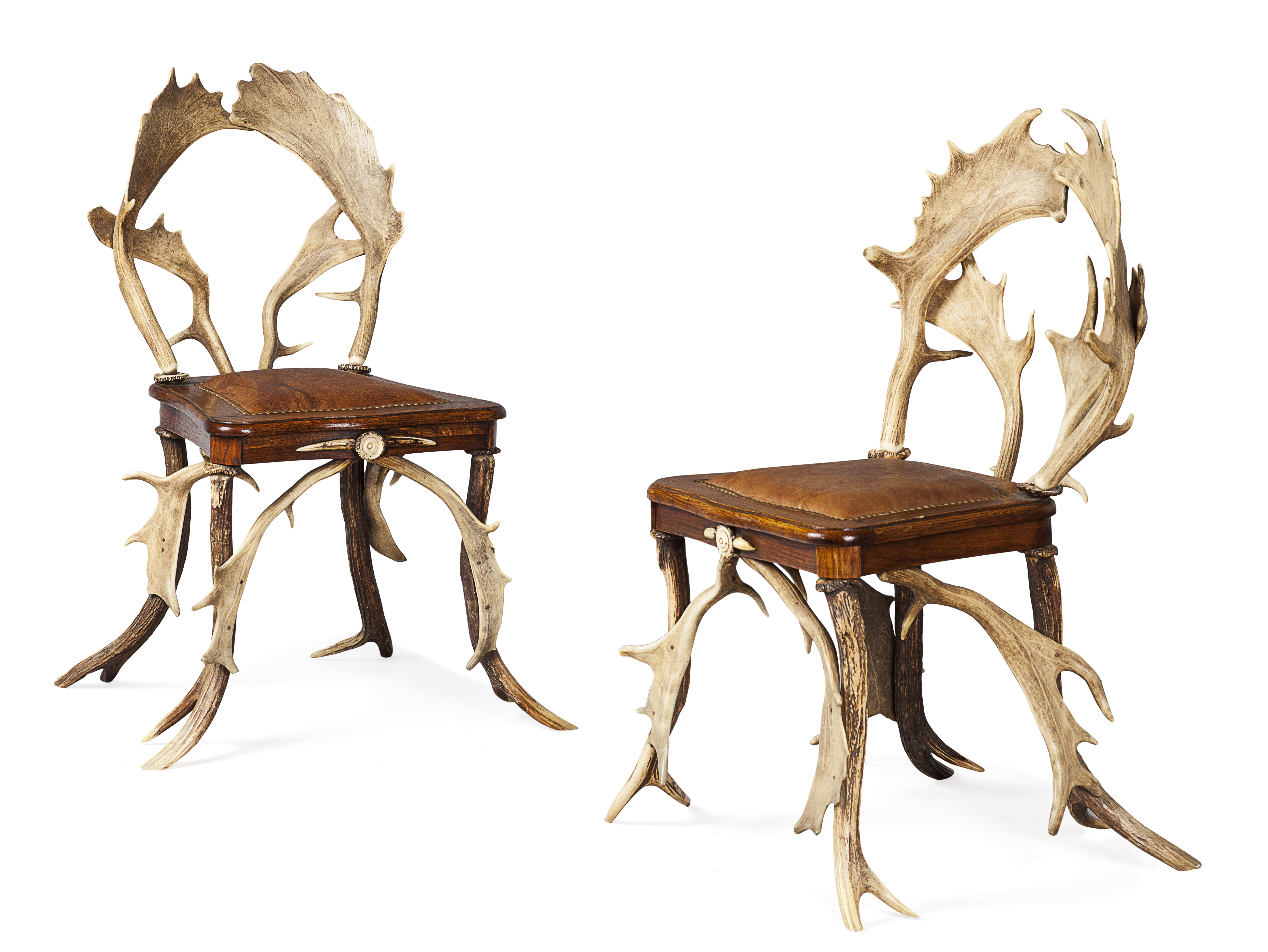 each with back and legs formed from entwined antlers, with oak framed seats with close nailed leather upholstered panel seats (2)