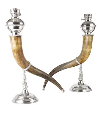 the twisting horns mounted on circular bases and supported by rings decorated with olive leaves and stands with foliate decoration, fitted for electricity (2)