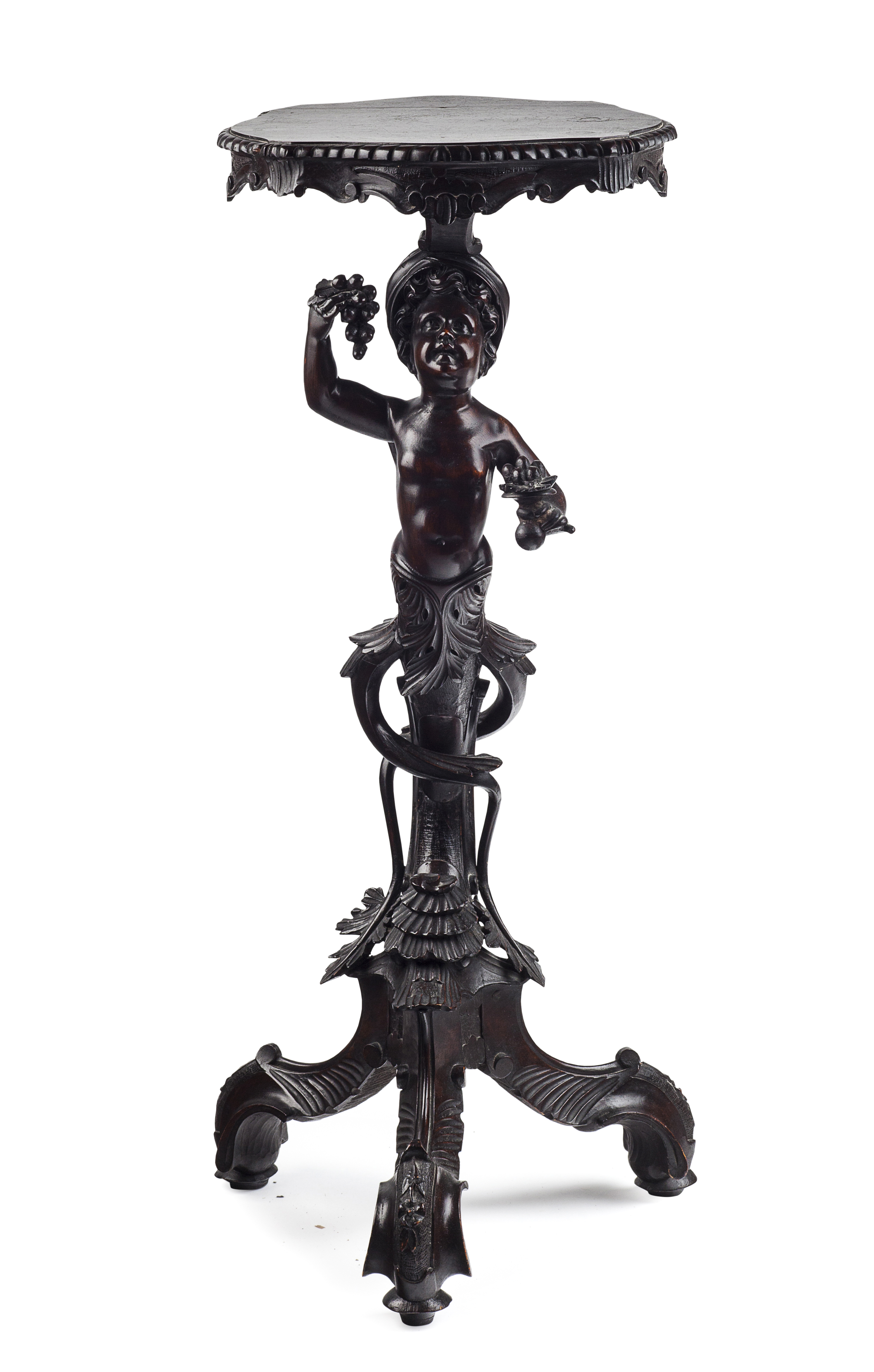 the shaped platform top on a support carved as a Moor holding fruit, on a shell carved tripod base
