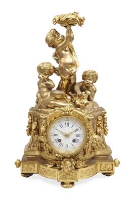 the white enamel dial with Roman and Arabic numeral chapters and two winding holes, in a gilt bronze case modelled as a column base hung with grape vines and surmounted by three bacchic children, on a shaped plinth base with a portrait profile medallion depicting Minerva, on foliate bun feet, the eight day movement striking on a bell